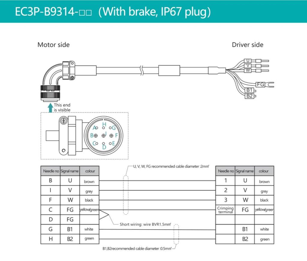 - Power Cable with Brake for EM3A power size of 1.5kw~3.0Kw and EM3G power size of 0.9kw~1.8kw.