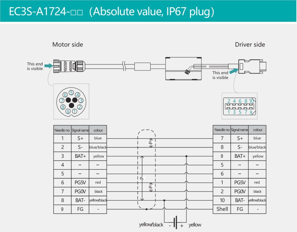 - Absolute Encoder Cable for EM3A motors with the power size of 50w~1Kw, maintains the Absolute feedback even during power-off. As a result, it retains its position, and no homing procedure is necessary after powering on when the Master Controller communicates with the drive. The built-in indexing function also takes advantage of ABS feedback.